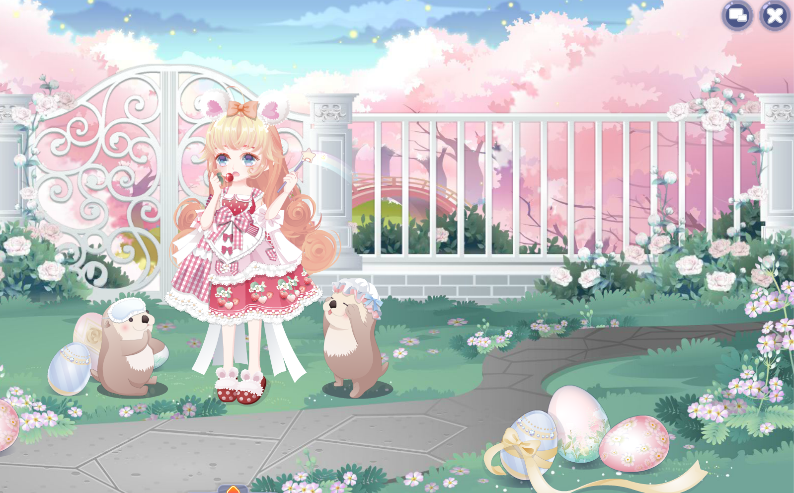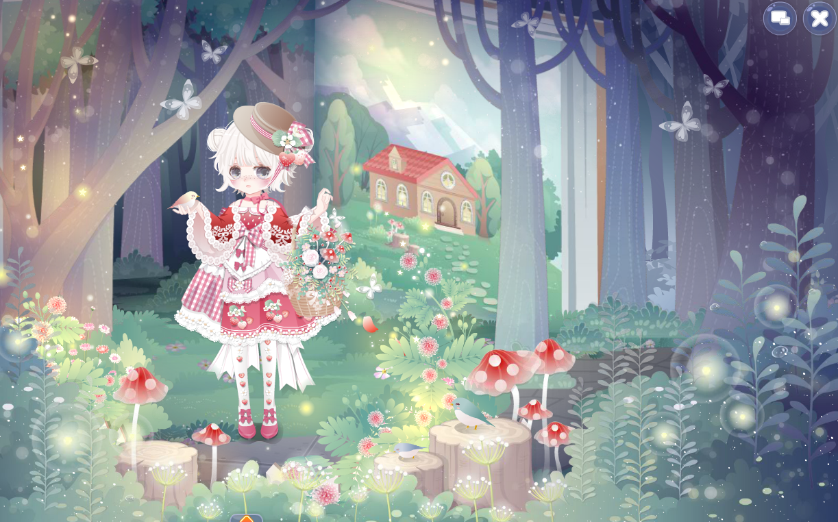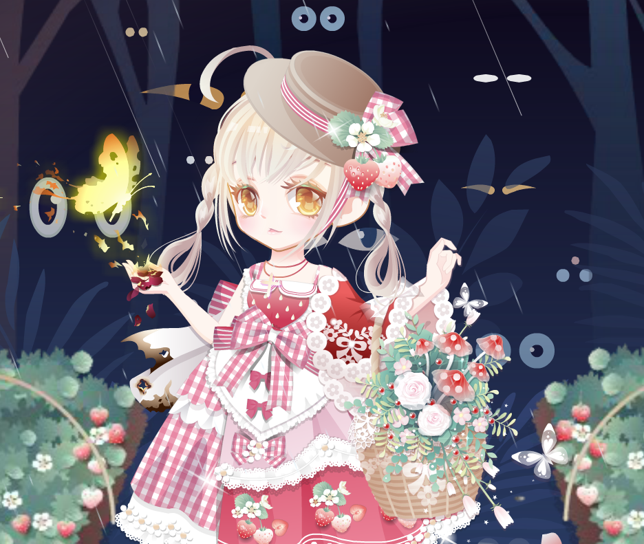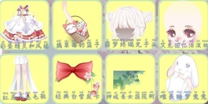 可爱草莓萝莉裙、红房子毛毛鞋、樱桃甜心右袖、时光精灵长发、精灵呢喃表情、魔法星愿左手、鼠小姐初恋耳朵