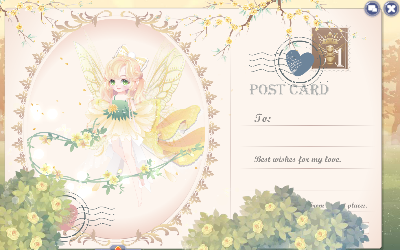 千公主藤蔓鞭子,卯时晨兔头饰,凯汐公主卷发,时光精灵蝴蝶结,时光精灵悬腿,时光精灵翅膀,幼龙公主可爱妆,黄色菊花精灵裙,枫国新娘远景,枫国新娘花圃,月宫仙子桂花,奇幻旅行邮戳,奇幻明信片