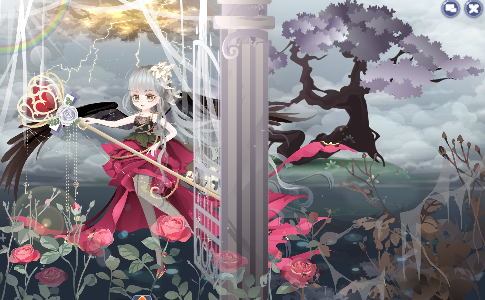 就在奔逃的大团体中,一只银发金眸的玫瑰精灵逆着人群坚定的擦身而过,她的长裙被腐蚀的破破烂烂,象征花玫瑰也发黑枯萎,可她依旧坚定的向前。她张开双翼,飞过祭台的残垣断壁停在空旷的石台上方,头顶雷云作响,往日里美好的彩虹也变得不详。玫瑰精灵注视着混沌的源头,张开双臂召唤着属于她的玫瑰,玫瑰花丛从被污染的河流里生长,浓烈的红毫无保留地贡献出生命力与信念,一朵枯萎就会有新生的一朵补上。一把巨大的钥匙逐渐显现,随着钥匙光芒大放,魔法破坏的平衡也被恢复,就在天空放晴之时,所有玫瑰也枯萎凋零,玫瑰精灵抱着封印魔法的钥匙筋疲力竭的坠落于变得清澈的河流里。