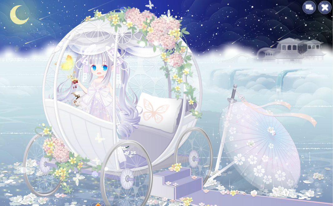 搭配部件:飞碟扑火掌上花、星辰点缀、星少女外裙、调皮小妹头饰、爱梦幻音灵裸脚、幻兔精灵双马尾、艾雪芭比精灵妆、千公主专用马车、清明凄美剑伞、清明凄美花瓣、流星浪漫夜景、月宫仙境
