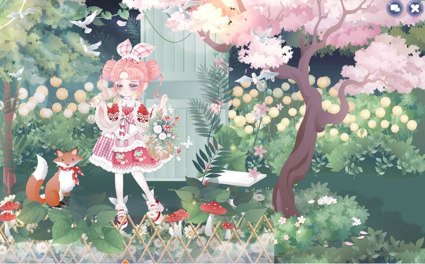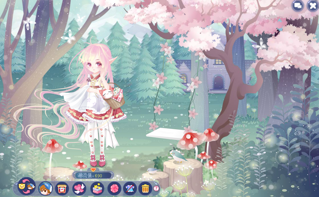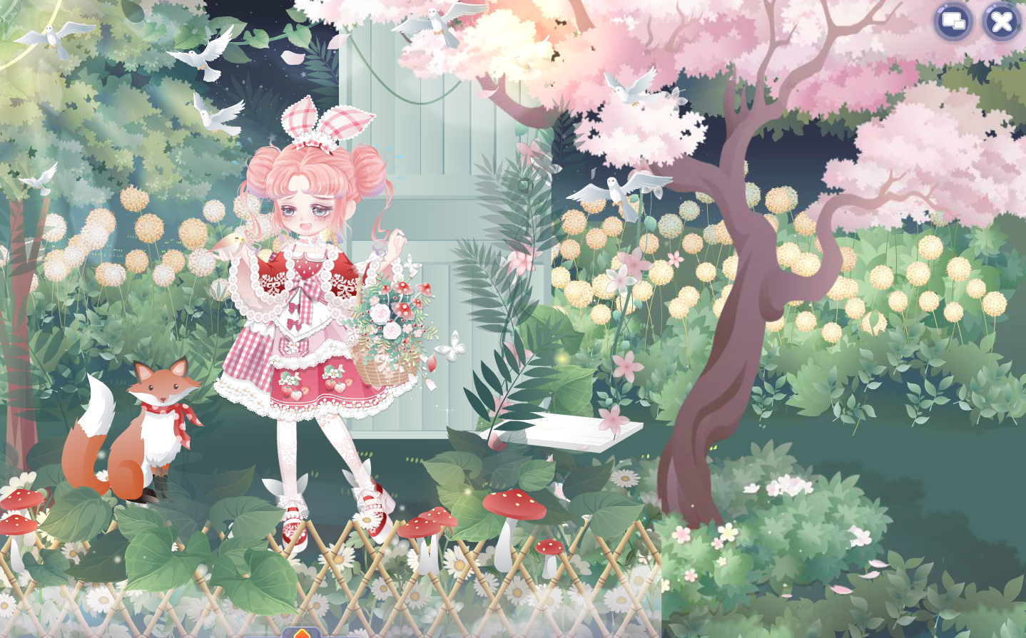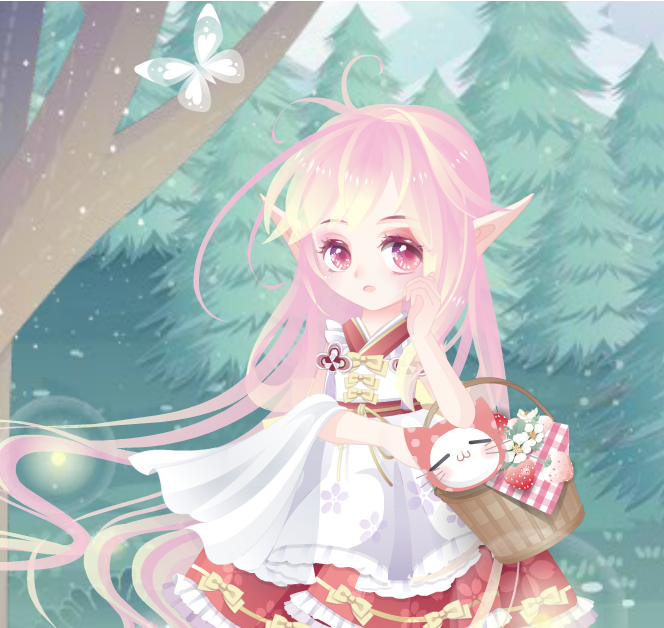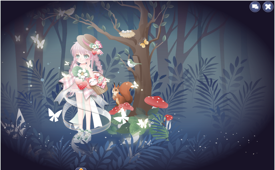 搭配部件:大草莓蝴蝶结 摘草莓的篮子 可爱草莓萝莉帽 微光之花 奥拉超星鞋子 生物室内蘑菇 生物室内大树 美术科代审美妆 天津可爱麻花辫 童话森林灌木丛 遗失梦境蝴蝶 lucky之梦背景 lucky之梦蝴蝶