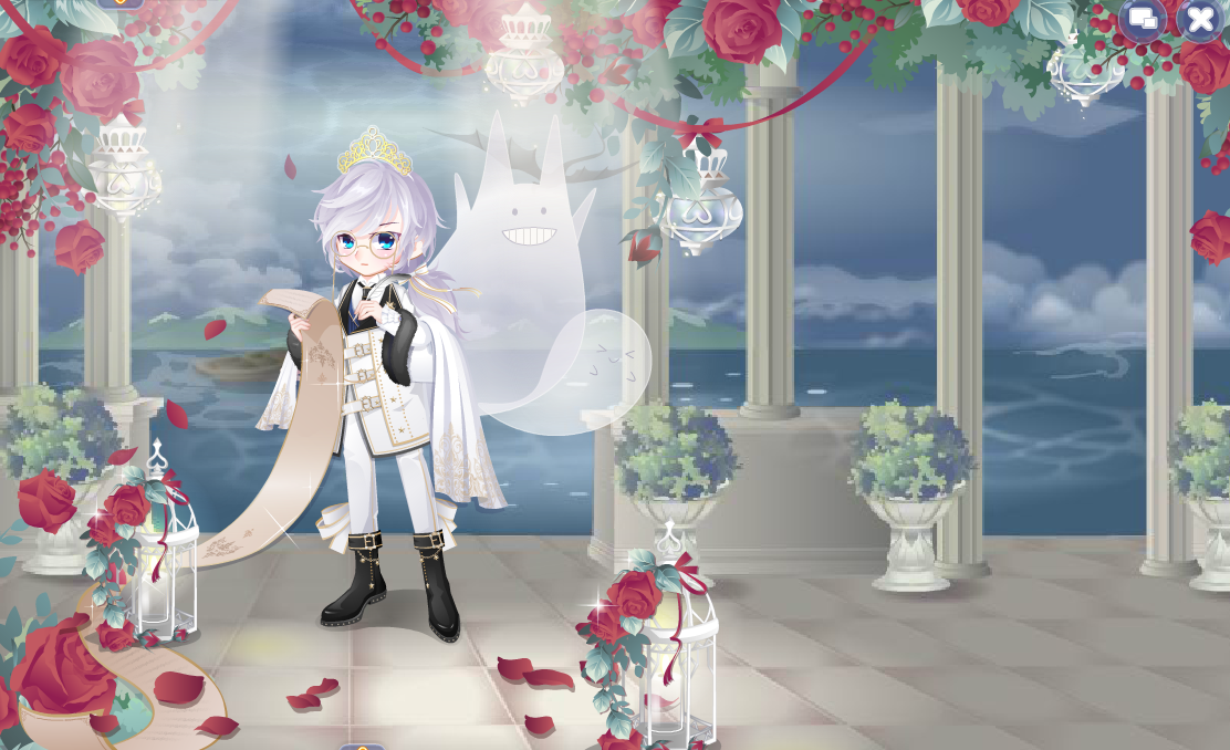 搭配部件:斯丁格管家卷轴,瑞文间谍暗黑鞋,瑞文暗黑西装,音乐科代长发,星辰陨落眼镜,星星魔法小精灵,恋精灵头冠,艾洛丝帅气妆,小白龙波光粼粼,龙新娘玫瑰背景,龙新娘玫瑰笼灯,龙新娘唯美花瓣