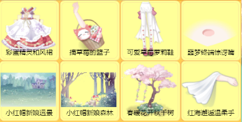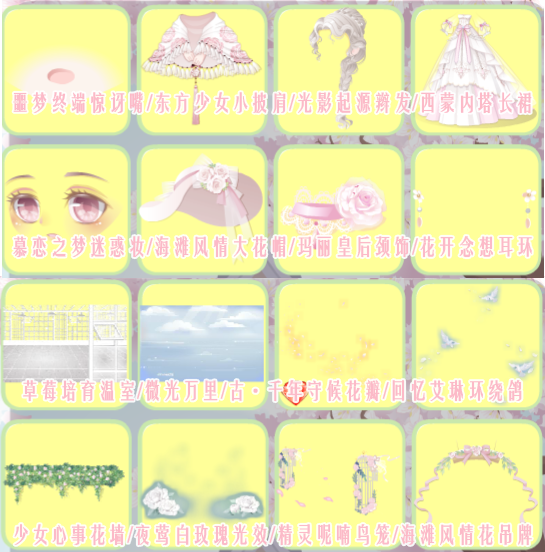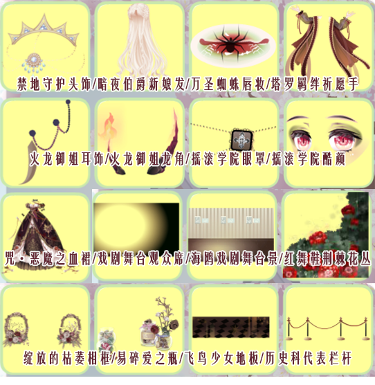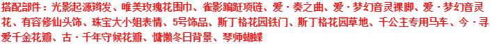 微光精灵;古·千年守候花瓣;暗夜新娘上衣;雀墟祈梦裸足;时光精灵花丛;雪之歌框架;梵花光玫愿景;梵花梦恋神誓;清新郊游头花;琉盏花洋怀表;魅精灵左手;花之灵翅膀;复古明星小白猫;