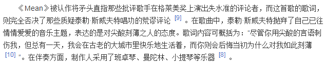 这首歌在开头和间奏部分都加入了一些钢琴加电子琴的感觉,差不多算得上一首Acoustic Version(采用多轨录音和电子音响合成技术的流行歌曲)就能显得歌曲的气氛更加凄凉婉转一些,不得不说霉霉真的很有创意欸!