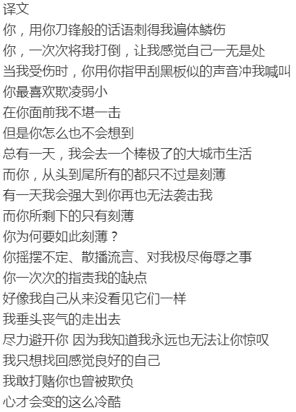 整首歌节奏很轻快,总能让人感到轻松,既有对于那些刻薄的人的指责,也有霉霉立志要变得强大的一种愿望,激励大家不要在乎那些人的刻薄,而要去强大自己,让自己无懈可击