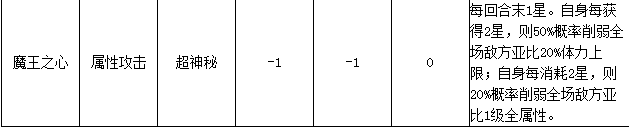 魔王之心:这个技能总体来说还算不错,获得星削体力上限,消耗星削全属性,根据效果来看这个技能本来在pvp中挺强的,但是由于撒旦面对主流很难脱到消耗/获得大量星的回合因此只能说比较鸡肋,不过削全属性在pve中还是挺吃香的