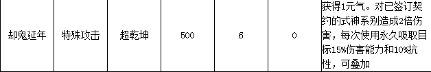 却鬼延年:对比灵魂晴明减伤逊色了一些,不过可以避免我方的印记被清空,吸收抗性效果没有实装,只能增加我方抗性不会减少敌方抗性,上限为60%,虽然比灵魂晴明少了20%不过也还算可以