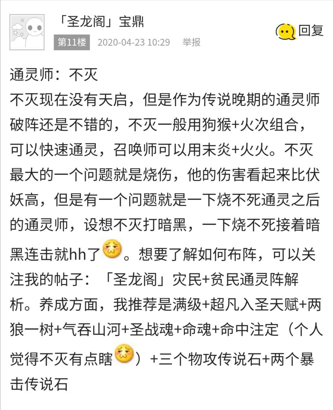 关于不灭,不能说他废了,因为他在排位时有奇效,不灭的作用是保队友、抗伤,同时快速通灵是亮点之一。但宝鼎的解析显然夸大了不灭的作用。我有3红不灭,从来不觉得不灭的烧伤有什么大用,甚至如果你把他的烧伤去掉加点属性我都觉得值。而他的解析里,不灭似乎成为了昆吾一般的跨时代强势精灵。但别说跨时代了,不灭传说时的表现就很一般。况且也不是传说后期,那时如果我记得没错好像才19年1月。算不上传说后期。