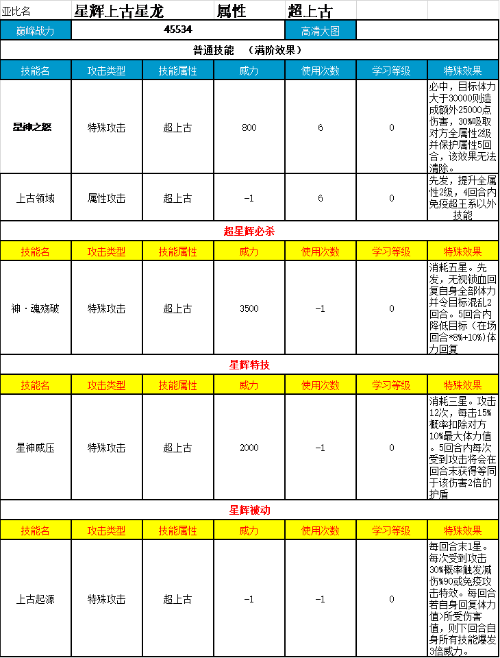 | 战神魂锁 | 属性攻击 | 超上古 | -1 | 6 | 0 | 先发,束缚目标亚比5回合,对方每次受到束缚伤害回复我方1星和35%最大体力值 |