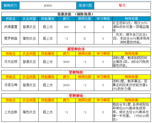 | 月落乌啼 | 特殊攻击 | 超上古 | 800 | 6 | 0 | 恢复自身被削弱的属性等级。下回合伤害提高100% |