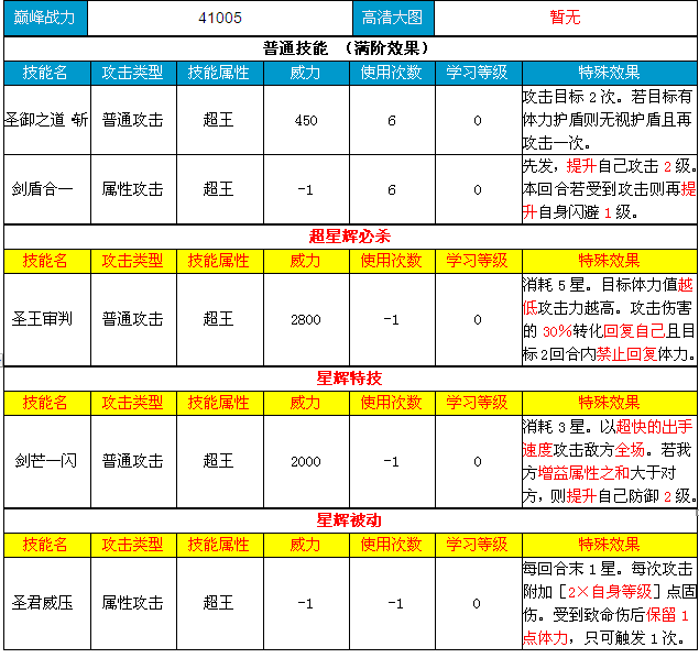 | 魂戮斩 | 特殊攻击 | 超王 | 3500 | -1 | 0 | 消耗五星。出手时若自身体力>=50%,则锁定对方属性无法提升5回合并令其减益属性翻倍,增益属性全部化为减益属性 |