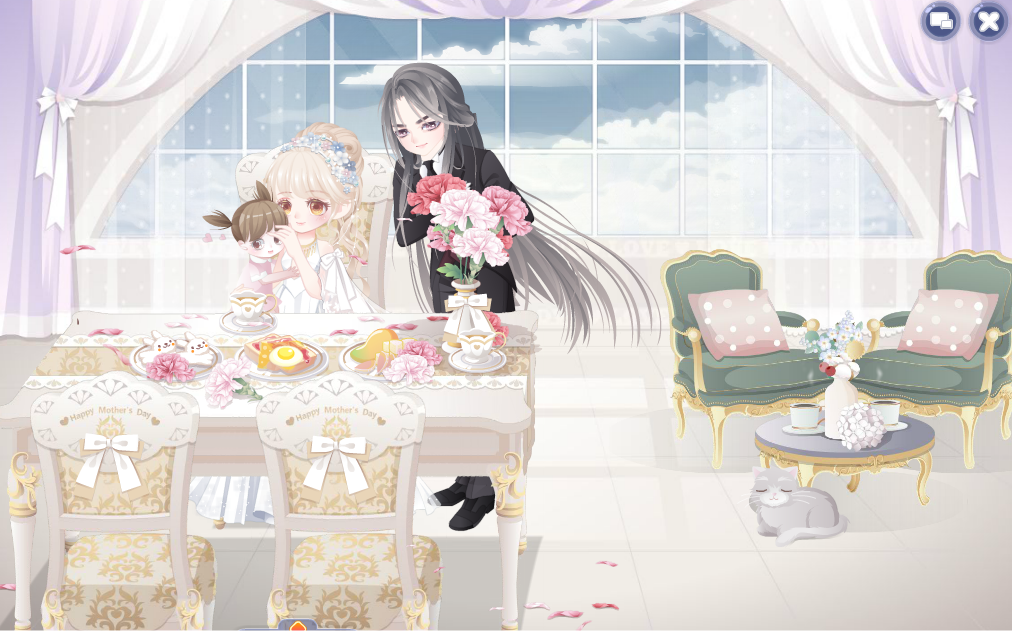 搭配部件:x.y典雅宴会裙、时光精灵微笑妆、幻·梦境使者左袖、萌萌小女儿、x.y花钻头饰、x.y时尚金色盘发、清新春日田园、精致早餐桌椅、设计间待客茶几、设计间待客沙发、浪漫满屋阳光房、专属执事魏子墨