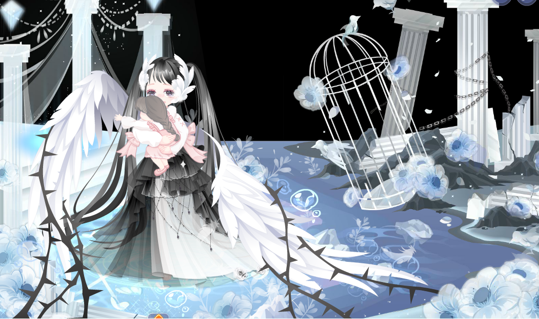 搭配部件:温柔妈咪妆,胆小娃娃嘴,温情怀抱手姿,蜕变星天使赤脚,绝望长发,心之牢笼翅膀,镜灵哭泣长裙,玫瑰夜莺翅膀,雀墟祈梦废墟,雀墟祈梦梦境灵坛,全屏魔力纯黑景