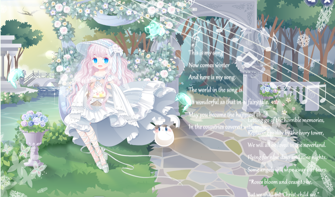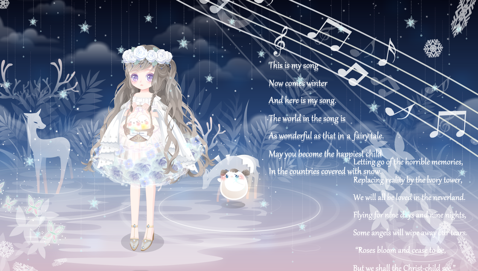搭配部件:温柔妈妈长卷发,温情怀抱手姿,雾凇遇雪长裙,涅槃零落舞步,H.X白梅纱外套,英式新娘光环,白女巫闭眼妆,生之礼赞白鸽,夜莺玫瑰背景