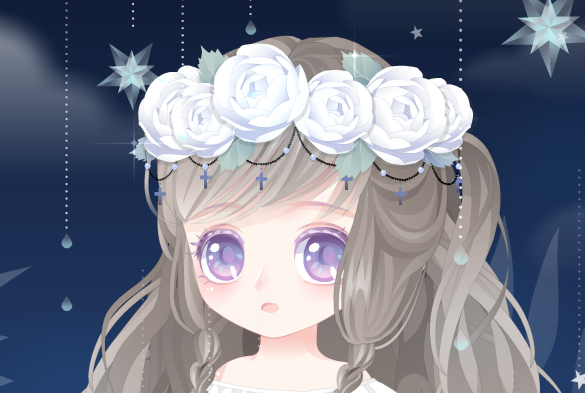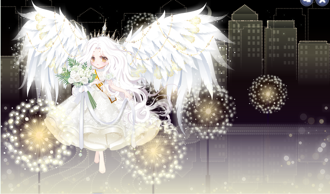 搭配部件:温柔妈妈长卷发,月下绽放女王裙,星月华丽羽翼,蜕变星天使赤脚,誓约新娘花束,浪漫巴黎圣女皇冠,珠宝大小姐表情,女神代言挂带,为你亮起的灯火,全屏魔力纯黑景