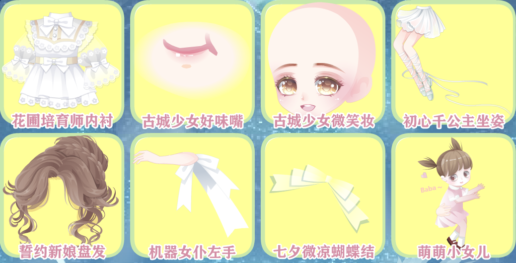 精致可爱厨娘裙、古城少女好味嘴、繁星捧花表情、星辰举手、活泼水母长发、瞬·时光守护左手、天竺莲月灯莲、次元哈欠机器腿