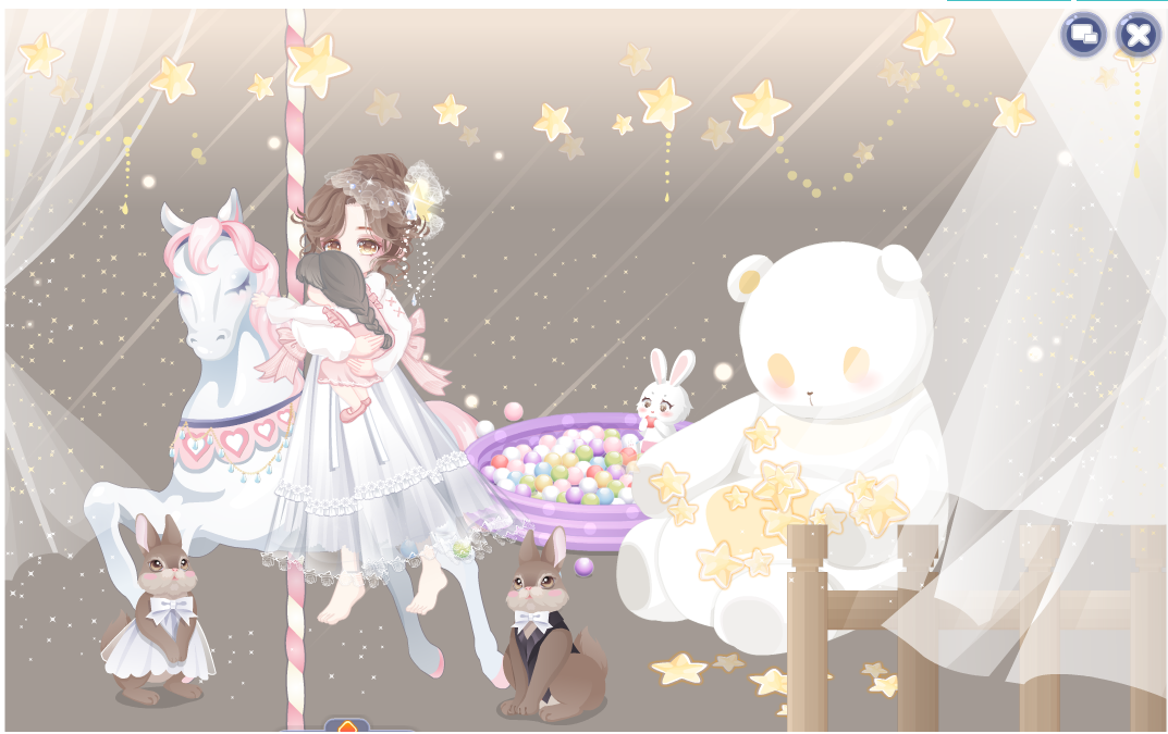 搭配部件:温柔怀抱手资,古城少女微笑妆,睡醒了赤脚,睡美人睡裙,誓约春暖盘发,纯蕾丝头花,卯时晨兔泡泡池,游玩旋转木马睡醒了许愿背景,睡醒了星星挂饰,誓约新娘花兔,