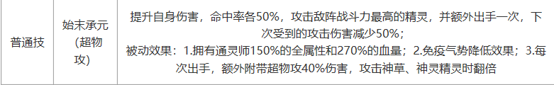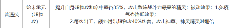 普通技始末承元,提升超物攻和命中各35%,攻击敌阵最高战力精灵。被动免疫降气且攻击附带非直接伤害(女帝和昆仑联合发来质问),非直接伤害对神草和神灵精灵翻倍。