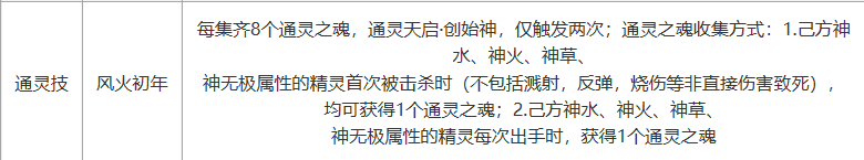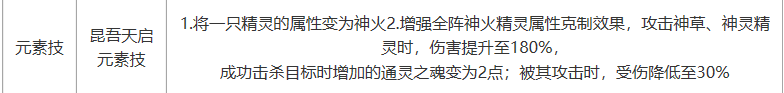 元素技效果基本都明白,将一个精灵属性变为神火,加强全阵神火属性克制,提升对神草神灵伤害,神草神灵攻击己阵神火伤害降低,击杀神草神灵精灵增加通灵之魂变为2点。