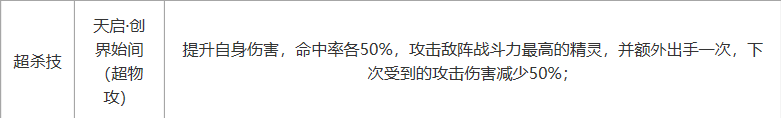 超杀技天启.创界始间(名字差评,你又不是创界神),提升超物攻和命中各50%,攻击敌阵最高住哪里精灵,并额外出手1次,降低下次受到攻击的50%伤害(跟究是有区别的,究可以降低非直接伤害,昆吾这个不行)。