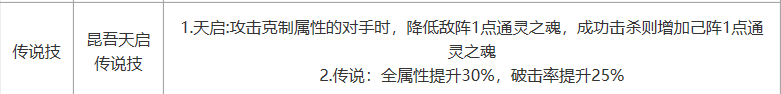 天启效果不解释,除双生龙外所有天启精灵天启传说技的天启效果均为此效果,由于昆吾为元素通灵师,因此天启效果在配合元素技击杀克制精灵时非常强力地弥补了昆吾阵通灵速度较慢的缺点。