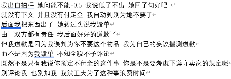 “好吧”又不是预定,谁知道要不要,也没加联系没付定金,反正我感觉可以出给别人,就这还说你毁单,逻辑怕不是有问题。抱抱姐妹