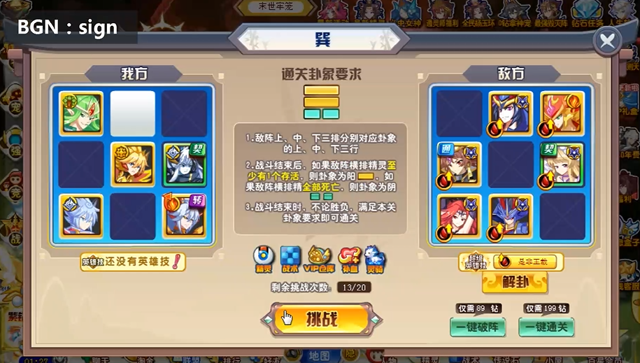 第三关上排放连击精灵,中排路西法(阵亡不阵亡都行),如果没英雄就在下排放一个(是否阵亡皆可)