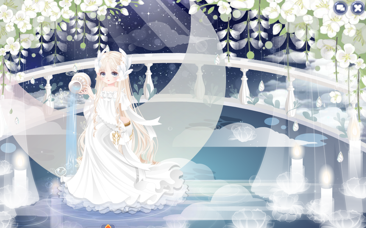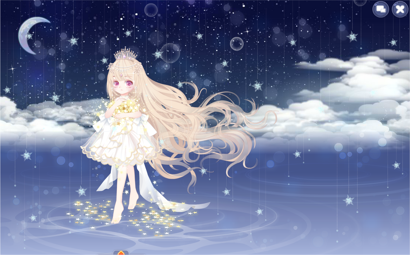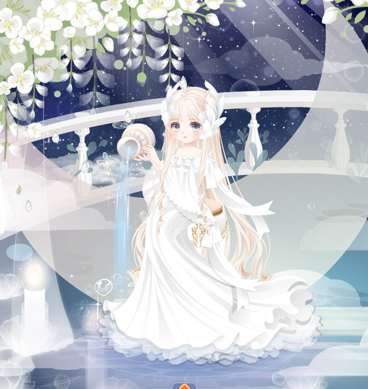 搭配部件:花溪女神漫步腿、玉宫流沙金月、星辰花冠、缘之录心动左手、花梦莹蝶白长发、蜕变星花朵、星之庭苑泡泡裙、璀璨婚宴耳钉、天鹅之吻流星雨、月之女神妆、快乐之花全屏景、陌上公子湖面影、璀璨的银河系