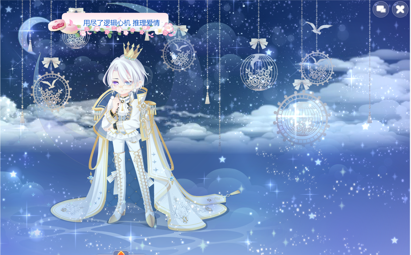 搭配部件:初心罗斯皇冠、x.y春夏珠耳环、希王子加冕披风、希王子加冕双手、希王子加冕上衣、月球王子制服靴、复古浪漫金框镜、誓约新娘尾结、梦幻繁星薄雾云、梦幻繁星幽月、心灵魔导师男神妆、幽灵少年白短发、快乐之花全屏景、陌上公子湖面影、爱之名星空滤镜、海鸥戏剧舞台饰。