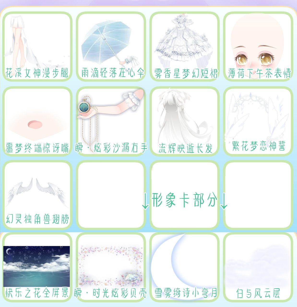 花溪女神漫步腿、玉宫金丝雪纱、玉宫薄翼轻纱、玉宫萌动兔唇、玉宫飘逸卷发、伊瑟拉女王头冠、伊瑟拉女王额饰、星河捧星手、璇玑长耳坠、筑梦星精灵妆、快乐之花全屏景、陌上公子湖面影、繁星捧花漫天雨。