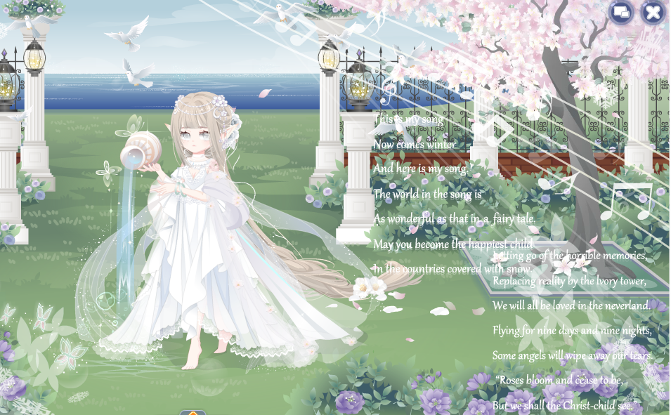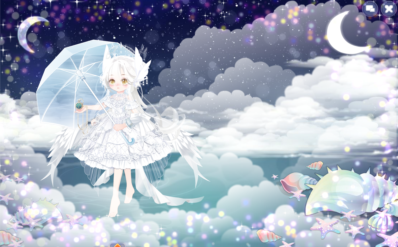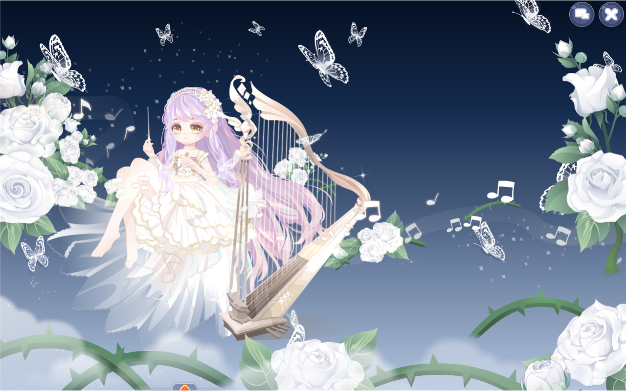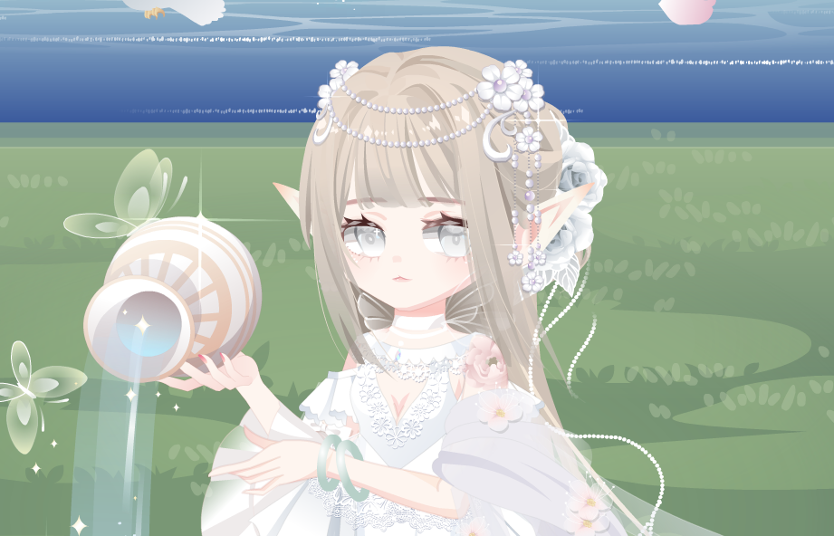 搭配部件:甜度夏日少女裙、噩梦终端惊讶嘴、雀墟纯白蝶饰、花梦萤蝶托蝶手、花梦萤蝶轻叹手、耀·偶像花拖尾、时光精灵微笑妆、洋桔梗黄长发、美人蕉女花仙翅膀、幻·梦境斑斓飞翔、爱·梦幻音灵颈饰、漫步云雾珍珠、漫步云雾相框、漫步云雾背景、朦胧香雾紫滤镜、爱之羽边框、雪之歌框架