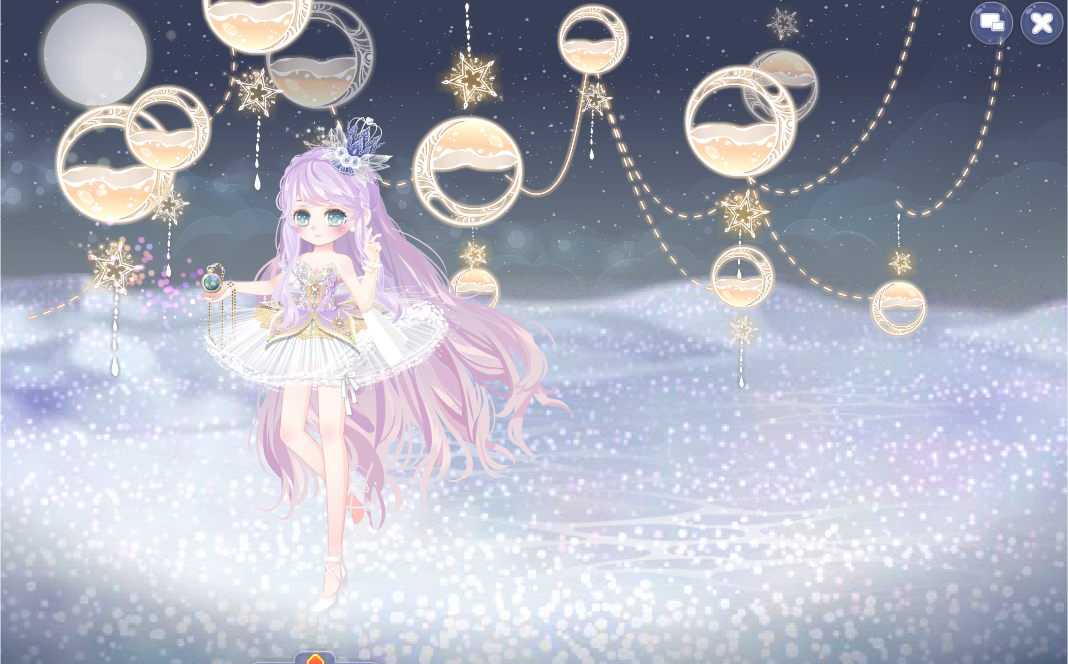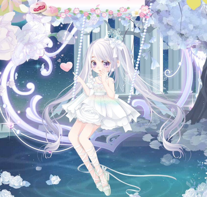 搭配部件:空想琳琅吊坠、瞬·时光守护沙漠、霜降月色夜、漫步云雾长发、空想比耶手、书画女子淡雅妆、双生羁绊白高跟、蒲公英芭蕾裙、瞬·炫彩沙漏右手、遗失梦境皇冠。