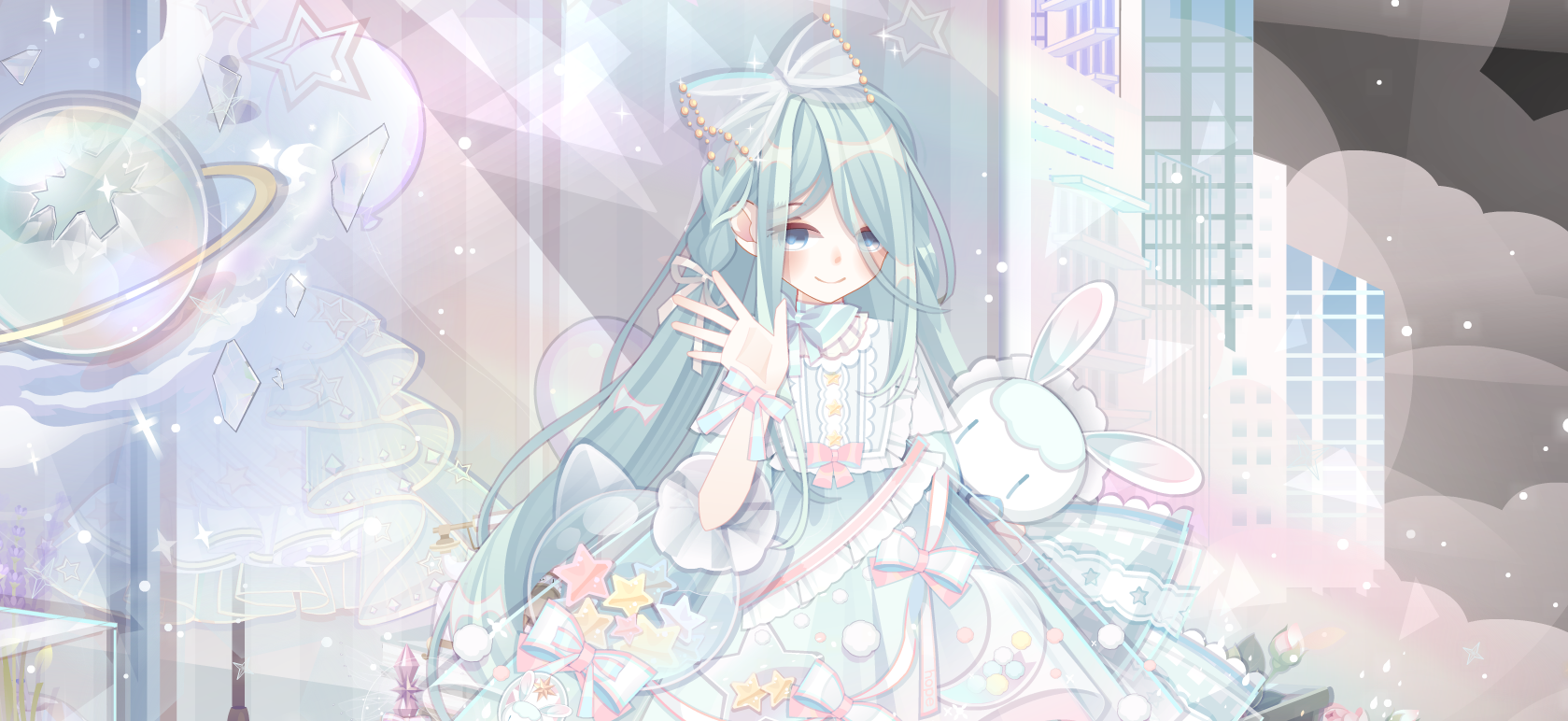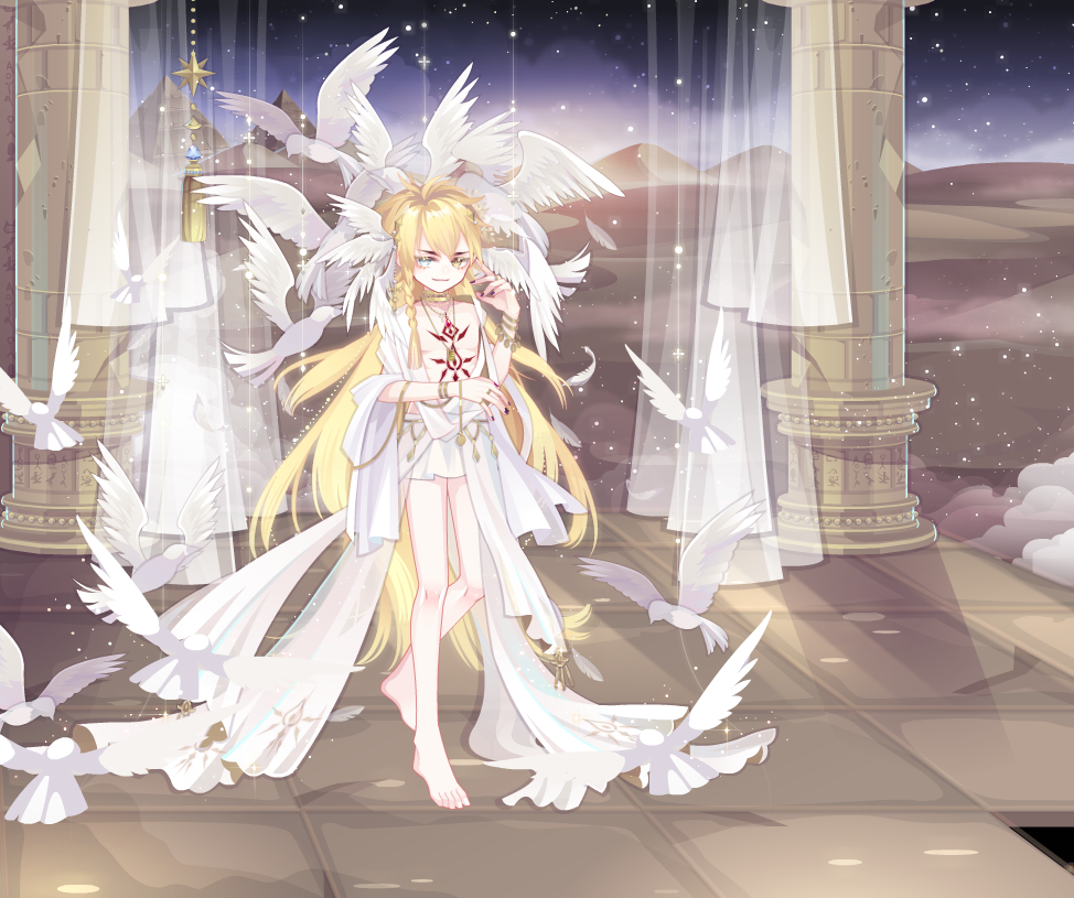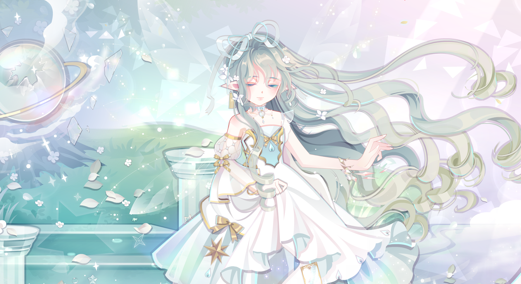 【搭配部件(手打或截图)】 花朝之神飘发、朵朵西萝莉头饰、TV卡珊德拉安睡、锦鲤梦色颈饰、雪之镜正义长裙、PO·艾米女神腿姿、蒂妃妮卡大裙摆、斯芬克斯左手、星云幻海精灵瓶、风之女神翅膀、洛奇儿愈灵心境