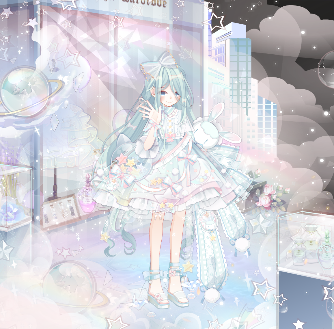 【搭配部件(手打或截图)】小公主睡醒发带、社恐少女蓝发、缝纫之森表情、豌豆公主颈饰、愿望女神裙子、朵朵西萝莉腿饰、锦鲤梦色鞋子、星云幻海精灵瓶、蒂妃妮卡橱窗