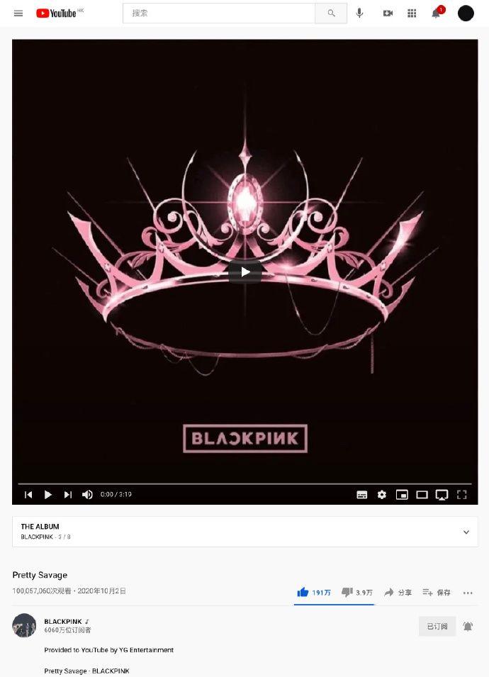 Pretty Savage音频播放量在You2⃣️be破亿,用时211天