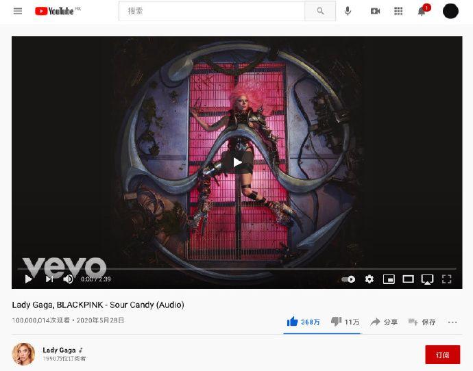 Lady Gaga, BLACKPINK - Sour Candy (Audio)音频播放量破1亿,用时350天。