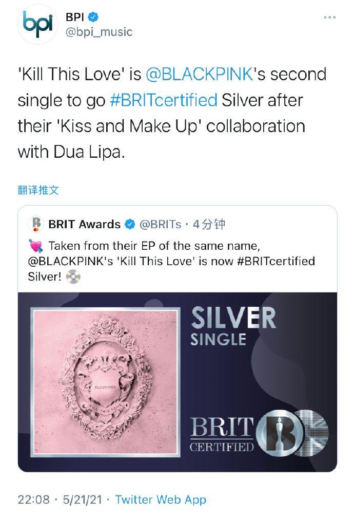 ‘Kill This Love’单曲在Y国??销量突破200,000,获得白银单曲认证