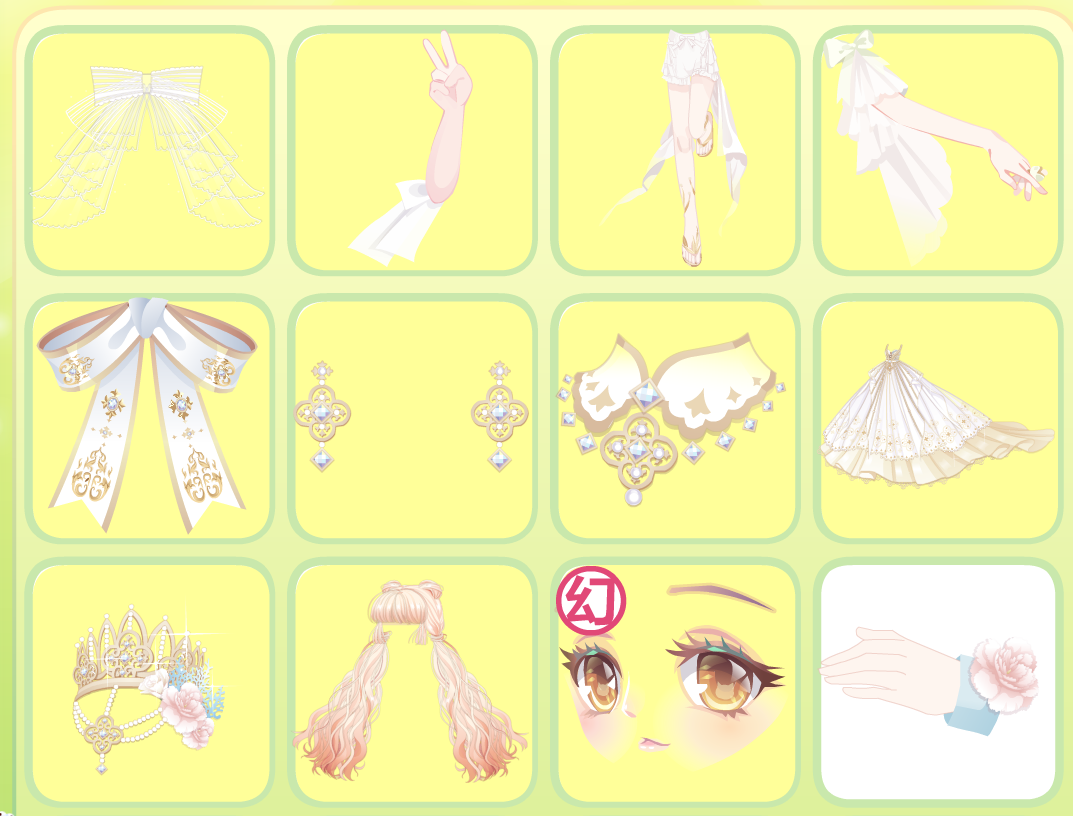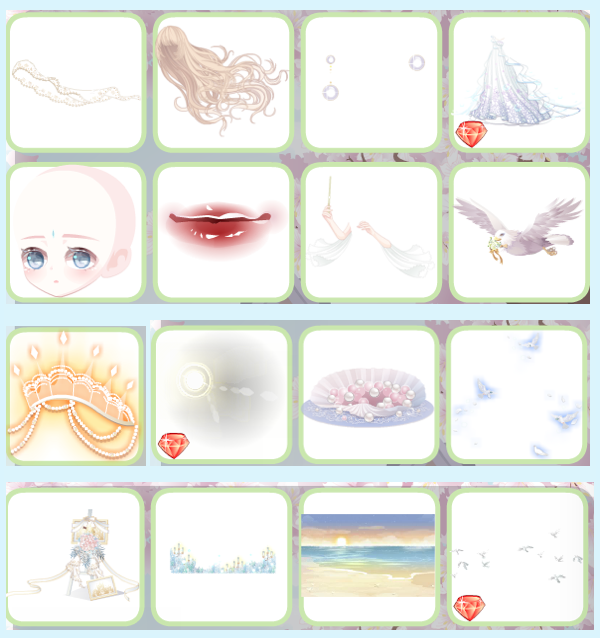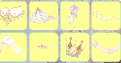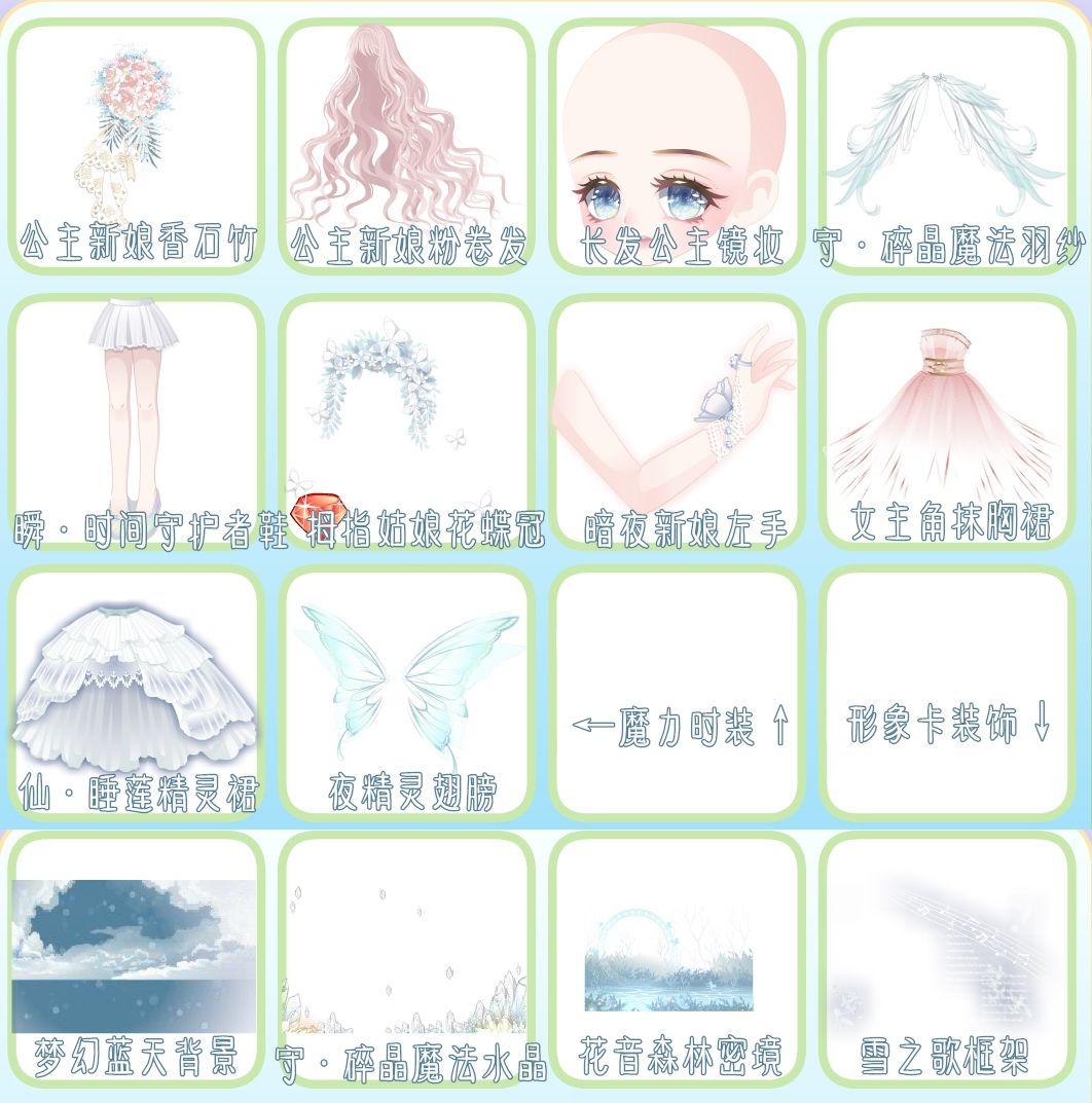 邻家萝莉梦幻纱 邻家萝莉比耶手 星冕庆典游行鞋 星冕精灵左手 王子新郎头饰 公主新娘耳环 公主新娘项链 公主新娘缎婚纱 公主新娘宝石冠 清爽红柚双发辫 珠宝大小姐表情 星冕庆典礼卡 星冕加冕礼 海底婚礼装饰画