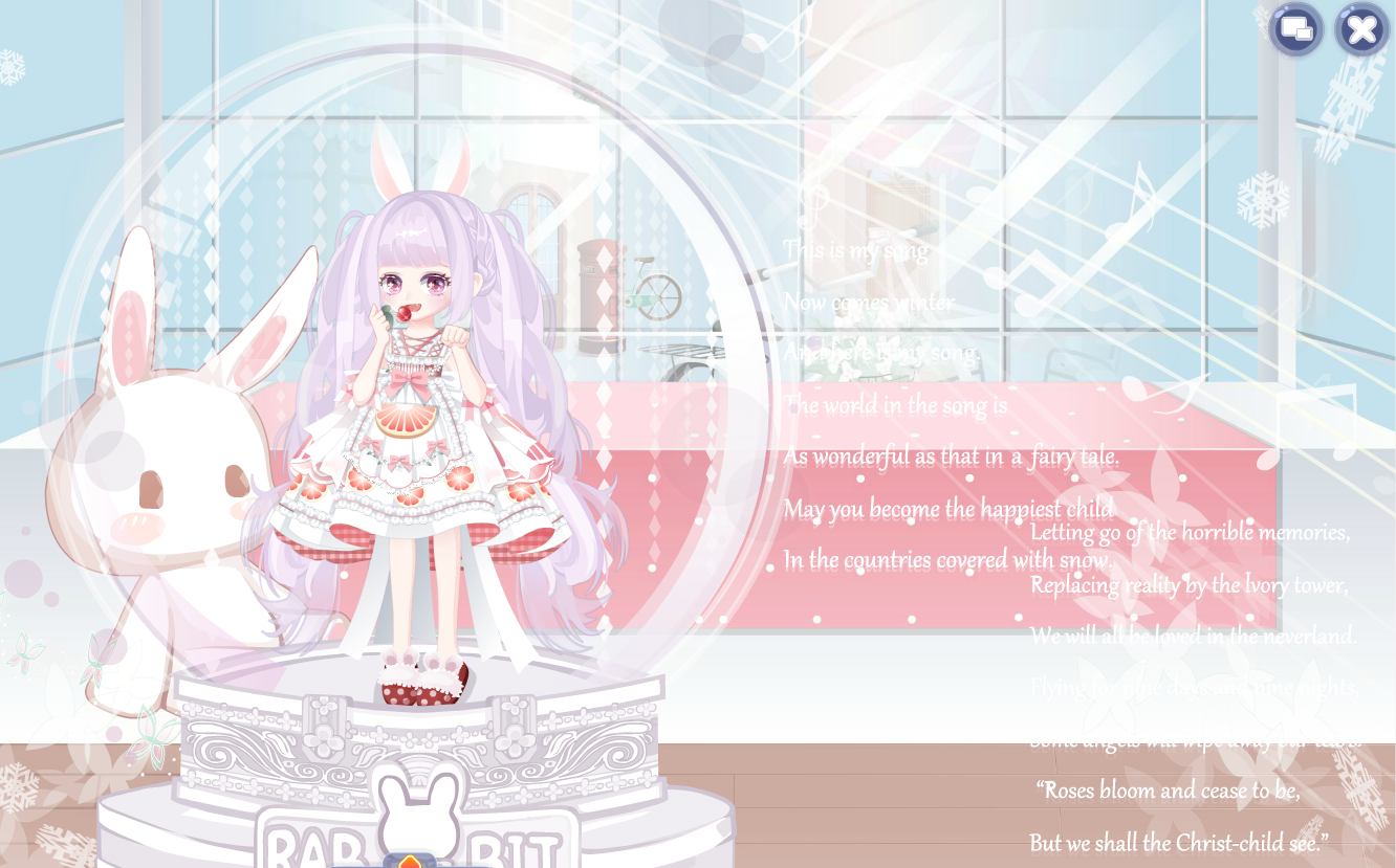 搭配部件:公主新娘俏丽妆,清爽红柚软萌裙,玉宫灵动兔兔,星辰交汇,红房子毛毛鞋,生之礼赞开心笑,樱桃甜心右袖,樱桃甜心左袖,邻家兔兔水晶球,清爽红柚橱窗,夹心软萌兔兔,雪之歌框架