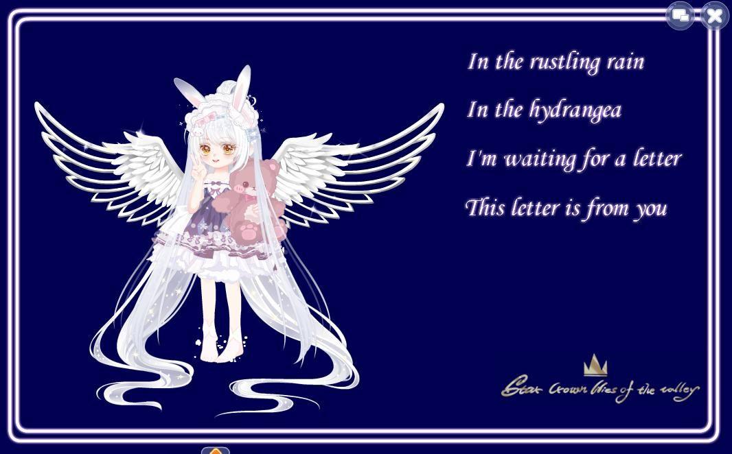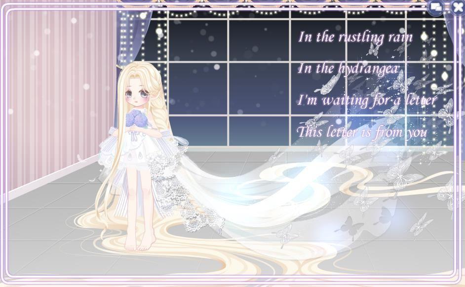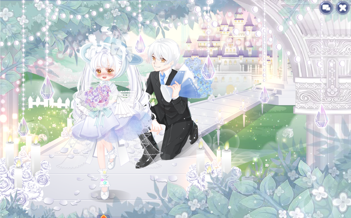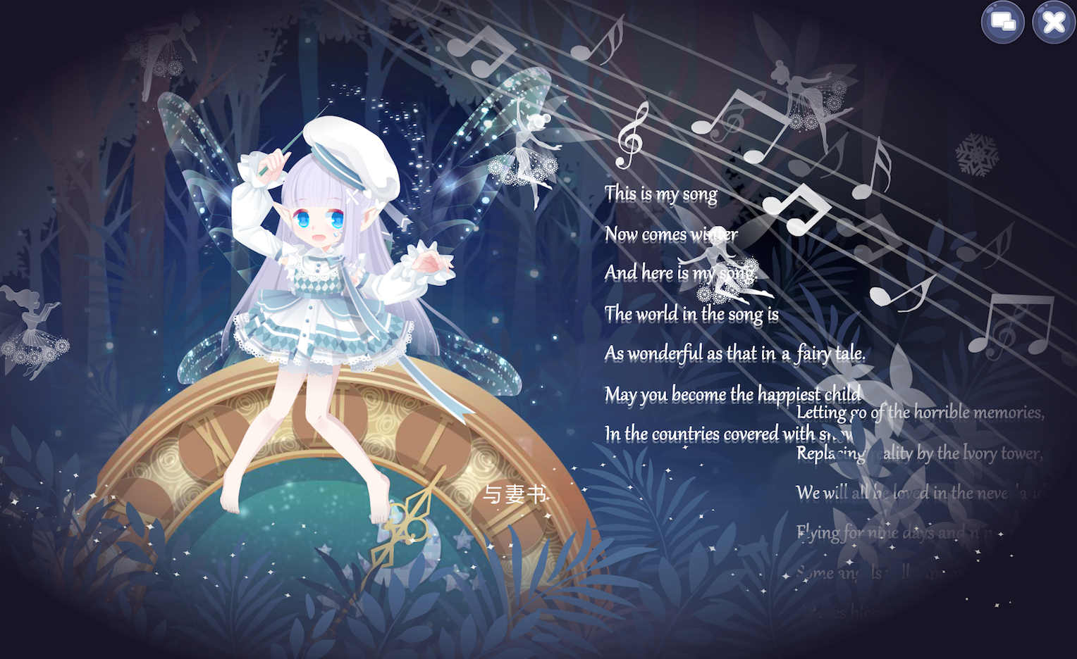 搭配部件:邻家萝莉梦幻纱 西式复古娃娃帽 大兔子水手裙 星冕温柔星辰妆 依赛娜偶像舞姿 雾香星双马尾 生之礼赞开心笑 花河绣球花束 恩冰脸红红蒸汽 邻家后花园 雾香星香薰城堡 雾香星香水河 海适花闲新郎 花梦莹蝶水晶坠 熏衣花嫁亭