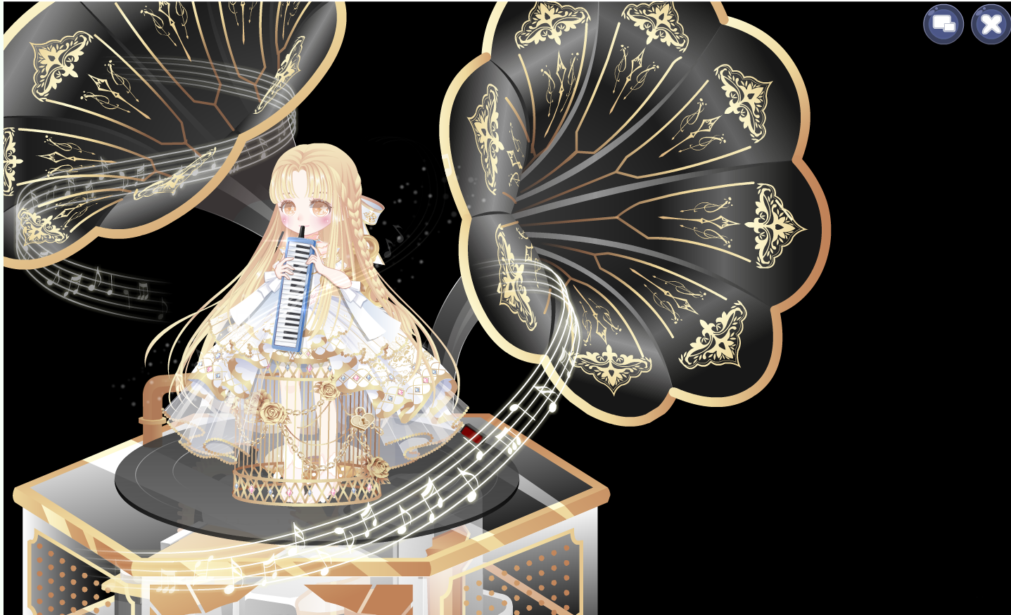 搭配部件:王子新郎头饰、花音星陶醉之颜、囚牢之裙、以爱之名口风琴、生之礼赞站姿、天使联盟羁绊发、发条音乐盒发条、双生水晶留声机、全屏魔力纯黑景、音乐科代音符