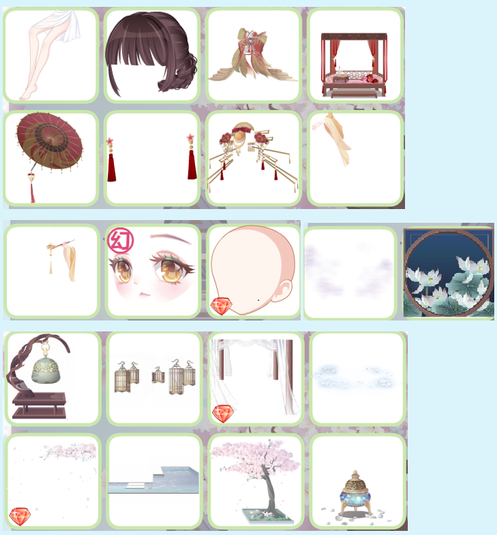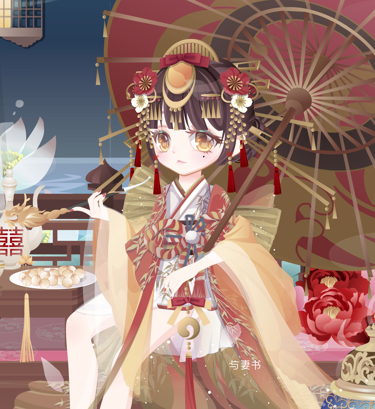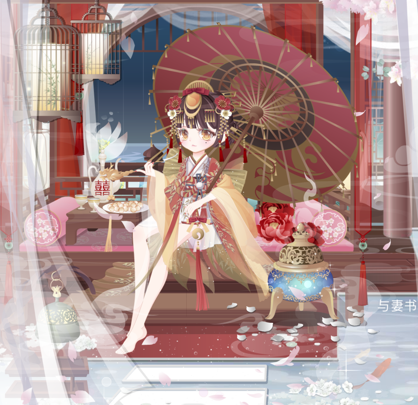 搭配部件:长发公主裸脚,欧式贵妇刘海,改良红和风短裙,华夏新婚喜庆床,伊邪那美红纸伞,伊邪那美流苏坠,伊邪那美大头饰,锦绣中华袖子,锦绣中华烟斗,珠宝大小姐表情,11号饰品,小倩清恬青烟,浩渺烟波画舫景,异兽白鵺夜灯,异兽白鵺鸟笼,巳时瑞蛇纱帘,清明凄美花瓣,今·寻爱千金花瓣,粲花阁水池,粲花阁紫荆花树,神秘传家香炉
