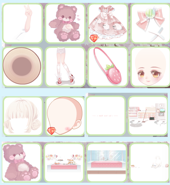 搭配部件:邻家萝莉比耶手,邻家小熊怀抱手,未时善羊裙子,未来星偶像发夹,古城少女圆帽,小红帽新娘内八,夏季草莓果冻包,时光精灵微笑妆,糖果熊包包头,24号饰品,猫与女仆字体,猫与女仆咖啡厅,邻家可爱熊,清爽红柚装饰,清爽红柚橱窗,波斯忆梦萌小猫