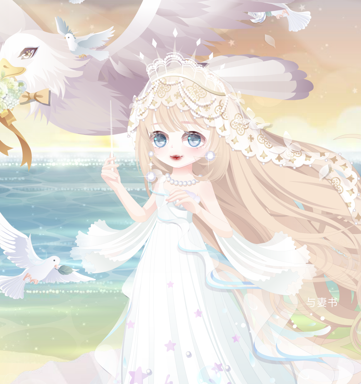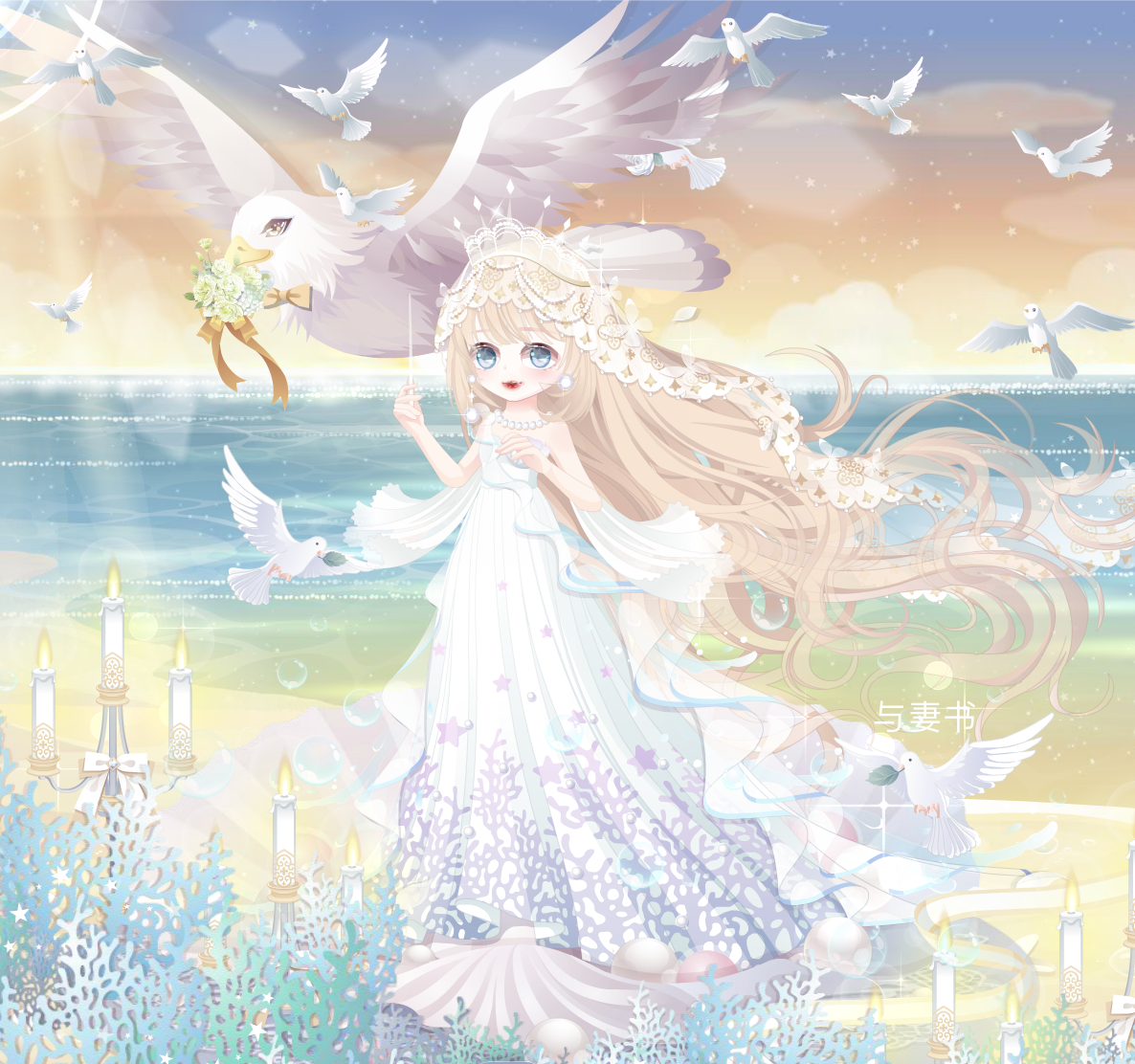搭配部件:公主新娘头飘纱,玉宫飘逸卷发,x.y春夏珠耳环,人鱼公主礼服裙,涅槃重生精灵,x.y气质唇妆,钻石海洋指挥手,风之女神随从,风之女神皇冠,寅时破晓阳光,维纳斯初生贝壳,回忆艾琳环绕鸽,海底婚礼装饰画,海底婚礼珊瑚饰,夏日黄昏背景,寅时破晓飞鸟