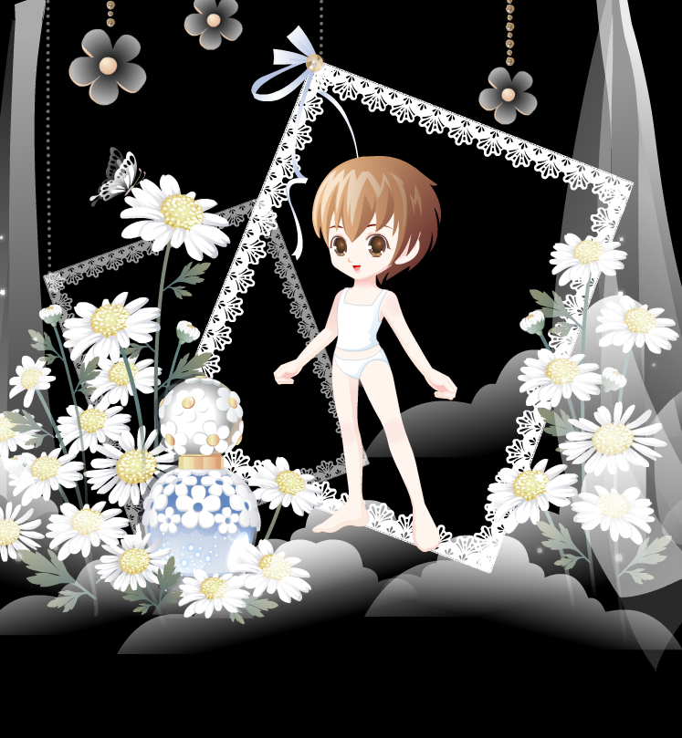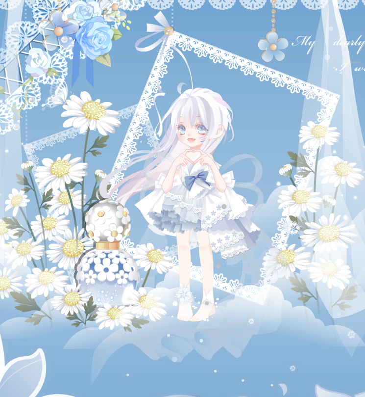 ·解析:这么好看的背饰居然是个小透明!我觉得再细化一下云雾阴影什么的可以直接参选奢华了,而且这个背饰当时只是消费晶钻免费抽宝箱的,四舍五入等于不要钱。设计感max,两边是雏菊,没开的开的都有,看起来不拥挤花蕊的细节爱了连高光都有点出,复制粘贴依旧貌美。左边有个香水瓶子呼应名字。中间是白色的蕾丝画框。加上云雾和飘纱简直仙气飘飘。